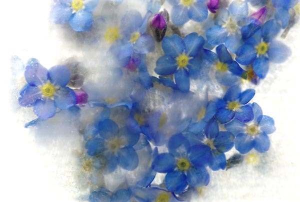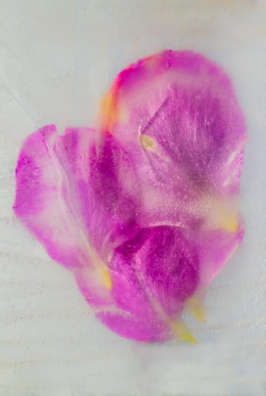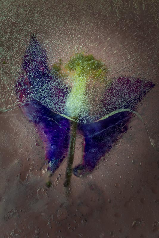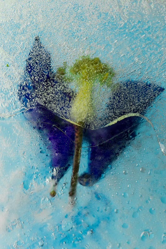 I first came across the idea of freezing and photographing plant material in Fleur Olbey’s book Fleur. I was immediately struck by the fragile beauty of the images. The way freezing had leached colour from petals making plumes and clouds in the ice. The way the ice and the subject interacted; bubbles of air in the ice and other imperfections framing and concealing. The sense of a petal or leaf floating beneath the ice surface made me feel as if I was gazing through a window into another world.