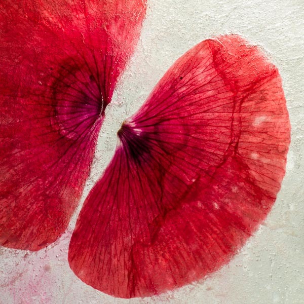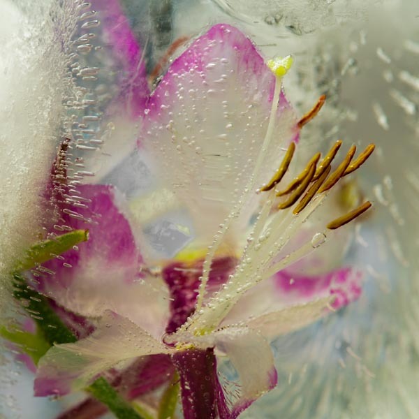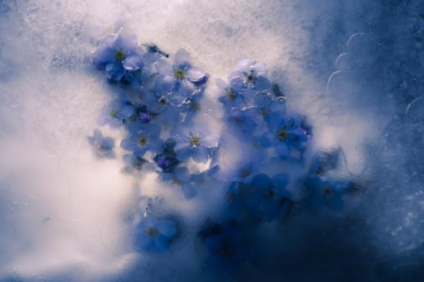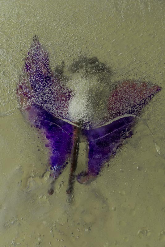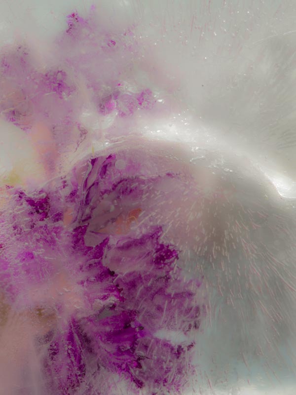 The images in the On Ice series are more about transformation than preserving. Although the freezing of flowers, petals and leaves halts the natural process of decay this is only temporary. As the ice thaws ironically decay is accelerated. Capturing an image becomes a balancing act between the beauty of the subject held in ice and it turning to mush.
